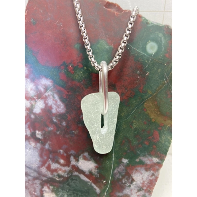 The photo of this piece does not do it justice. It’s a lovely pale teal colour. I’ve worked on this piece to give it smooth rounded edges and a hollowed centre. Complete with a large silver plated wire jump ring.