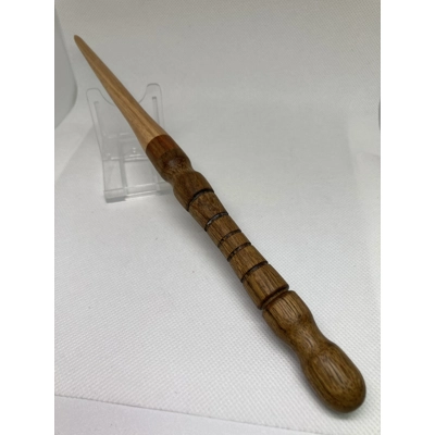 This is a sleek looking wand approx 10” long made from three types of wood. Light and elegant.